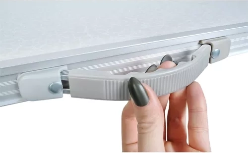 Ingeklapt verandert hij in een compacte koffer met handvat. Je neemt hem gemakkelijk in de hand en bergt hem op in de kofferbak of kast.