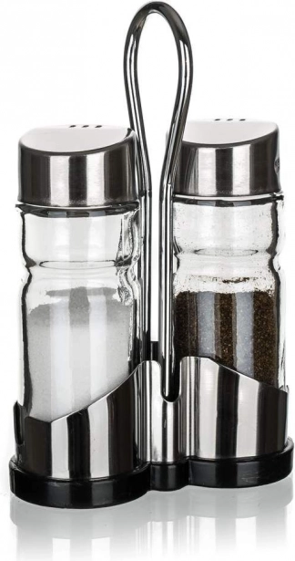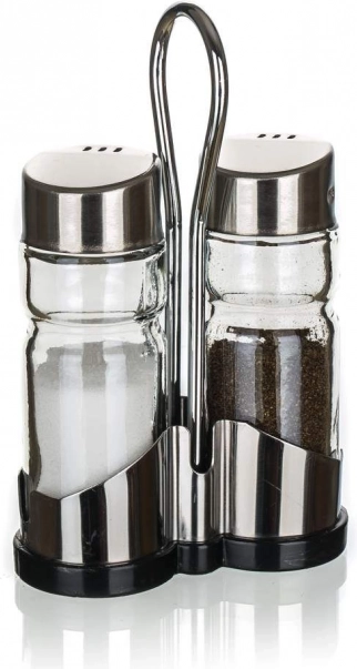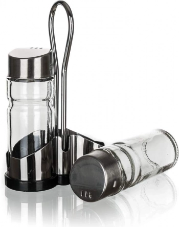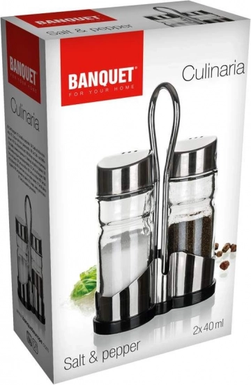 De Banquet-set voor zout en peper bevat twee glazen potjes met een inhoud van 40 ml, geplaatst in een metalen rek. Deze combinatie van glazen strooiers met zilverkleurige doppen geeft stijl aan uw tafel en zorgt tegelijk voor gemakkelijk op smaak brengen van gerechten.