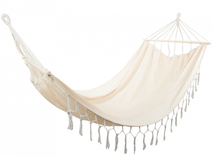 Houten spreidstokken houden de hangmat mooi open, stevige touwen zorgen voor stabiliteit en bevestigingskoorden voor snel ophangen zijn inbegrepen.