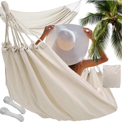 Installatie is kinderspel – bind beide uiteinden vast aan bomen, palen of haken. De dicht geweven ophangkoorden verdelen het gewicht gelijkmatig, wat comfort en levensduur verhoogt. De stof is machinewasbaar, dus schoonhouden is eenvoudig.