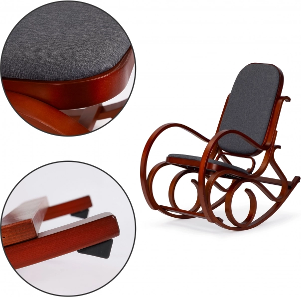Stijlvolle schommelstoel van ModernHome die comfort met tijdloze elegantie combineert. Biedt vloeiend schommelen, een stevige constructie met een maximaal draagvermogen van 120 kg, zachte schuimbekleding en veiligheids“voeten” voor het blokkeren van overmatige kanteling. Past perfect in zowel klassieke als moderne interieurs.
