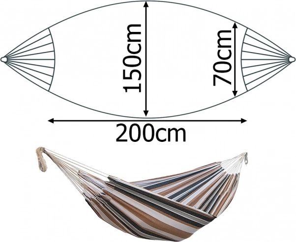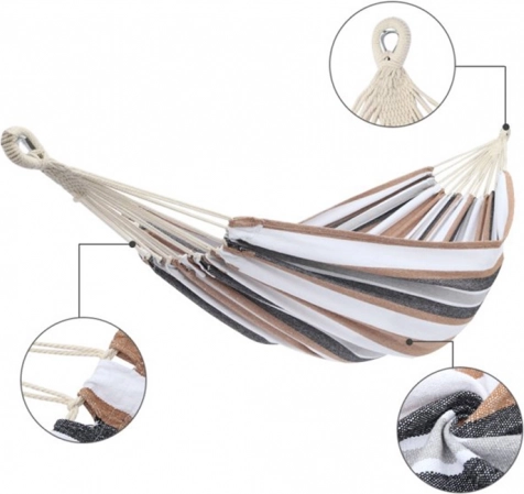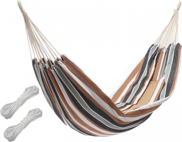 Geniet overal van zomerse ontspanning met deze ruime hangmat voor twee personen. Hij biedt een stevige constructie, duurzame en ademende stof en eenvoudige ophanging met de meegeleverde touwen. Dankzij een draagvermogen tot 200 kg, een compact draagetui en stijlvolle strepen is hij ideaal voor de tuin, het terras, het balkon en op de camping.