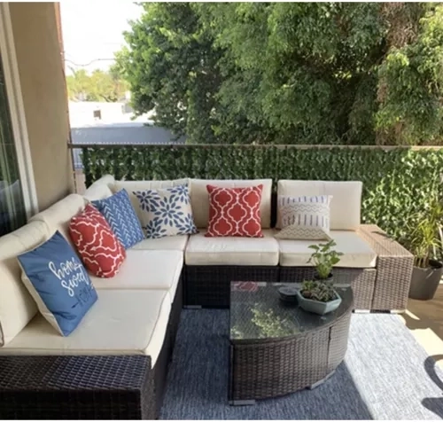 Deze kunstmatige klimopschutting is ideaal als visuele afscherming voor balkon, terras of hek. Het realistische bladerieffect brengt aangenaam groen in de buitenruimte zonder gedoe – geen water geven, geen bemesting en geen snoei. De constructie van hoogwaardige materialen is weerbestendig en eenvoudig schoon te houden.