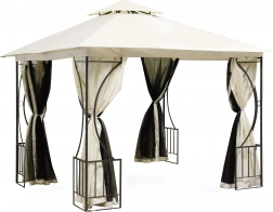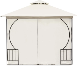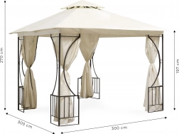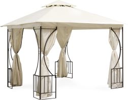 Dit ruime tuinpaviljoen in beige combineert een stijlvolle uitstraling met praktische bescherming tegen zon, lichte regen en insecten. Gepoedercoat staal zorgt voor duurzaamheid en krasbestendigheid, terwijl het dubbele dak de luchtcirculatie bevordert en water effectief afvoert.