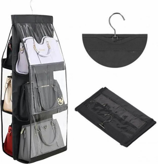 Organizer voor handtassen voor in de kast is de perfecte oplossing voor elk huishouden. Je kunt er tot 6 handtassen tegelijk aan ophangen, waardoor opbergen eenvoudiger wordt en de kastruimte efficiënt wordt benut. Gemaakt van duurzaam kunststof voor een lange levensduur en betrouwbaarheid. De volledig opvouwbare constructie betekent dat hij, wanneer hij niet wordt gebruikt, minimaal ruimte inneemt.
