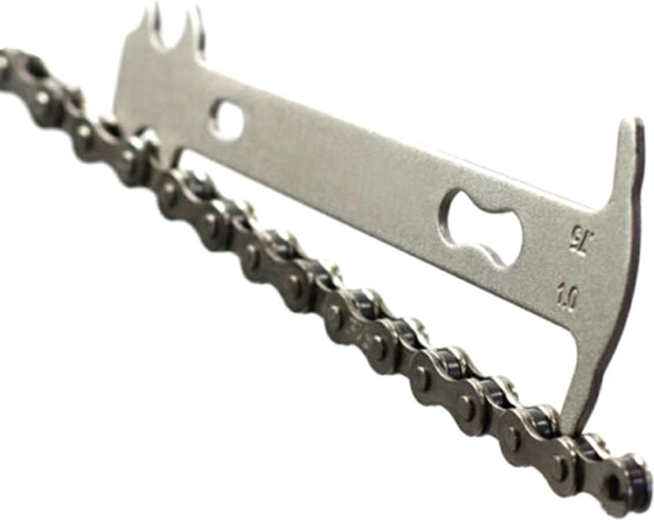 Compacte tool voor het controleren van de staat van een fietsketting. Zeer eenvoudig in gebruik: plaats het afgeronde uiteinde van de meter in een kettingschakel en steun het andere uiteinde tegen de strakgespannen ketting. De meter toont de mate van slijtage op schalen van 75% en 100%. Als het uiteinde van de meter niet tussen de schakels past, betekent dit dat de ketting in perfecte staat is.