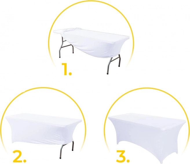 Met deze hoes maak je van een gewone tafel in enkele minuten een elegant meubelstuk. Leg de stof op het blad, trek de hoeken uit en bevestig hem aan de poten.