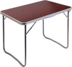 De tafel staat op een stevig metalen frame met vergrendelbare poten en anti-slip doppen voor extra stabiliteit. Het gelamineerde blad met houtdecor is makkelijk schoon te maken en vochtbestendig, ideaal voor gebruik buitenshuis.