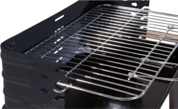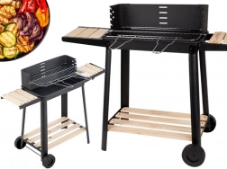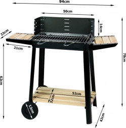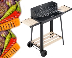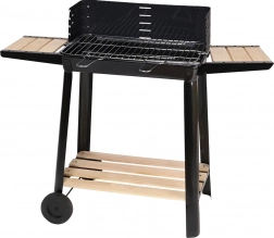 De barbecue is uitgerust met een verstelbaar rooster op vijf niveaus voor perfecte temperatuurregeling. Een praktische houten plank biedt voldoende ruimte voor het opbergen van voedsel en kruiden. Dankzij twee wielen is de barbecue eenvoudig te verplaatsen, wat de flexibiliteit vergroot.