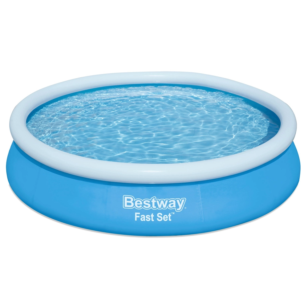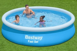 Het opblaasbare bovengrondse zwembad BESTWAY Fast Set is de ideale keuze voor snelle verfrissing in de tuin. De montage is in enkele minuten klaar – blaas de bovenste ring op, laat water in en de wanden komen vanzelf omhoog. Dankzij het stevige materiaal met duurzame afwerking is het bestand tegen dagelijks gezinszwemplezier.