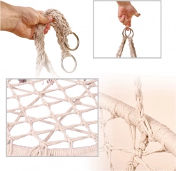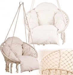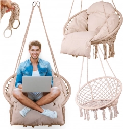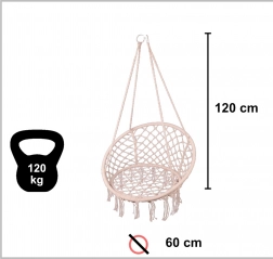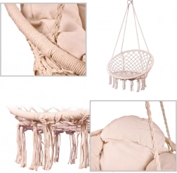 Deze hangstoel biedt comfortabel zitten voor momenten van rust en zacht schommelen. De grote ronde vorm en het zachte kussen ondersteunen een ergonomische lichaamshouding, terwijl stevige katoenen koordvlechten en het metalen frame zekerheid en een lange levensduur bieden.