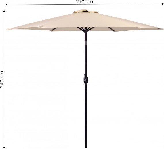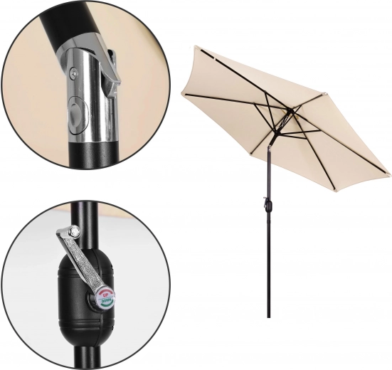 De kwaliteitsdoek van polyester 160 g/m² weerstaat zon en lichte regen, het stevige stalen frame (Ø 38 mm) met zes ribben behoudt de vorm en geeft extra stabiliteit. Het minimalistische design en de beige uitvoering passen op terras, in tuin, op balkon en bij het kamperen.