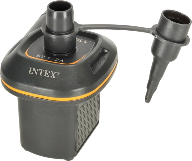 Compacte elektrische pomp INTEX Quick-Fill met USB 5V/2A die matrassen, zwembadringen en andere opblaasartikelen snel op- en leegloopt. Biedt tweerichtingswerking, hoge capaciteit 150 l/min en universele mondstukken voor verschillende ventielen. Dankzij de compacte afmetingen ideaal voor onderweg en te voeden via een oplader, powerbank of elke USB-poort.