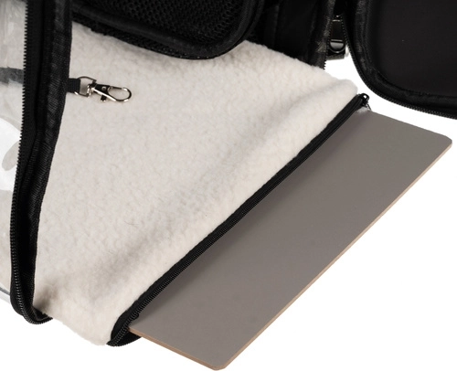 De uitneembare zachte inleg met verstevigde bodem en de interne veiligheidskarabijn zorgen voor comfort en bescherming van het dier tijdens de reis.