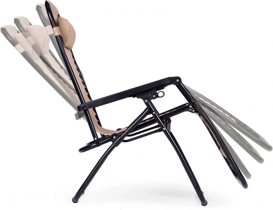 Dankzij de robuuste stalen constructie met poedercoating is de stoel stabiel in elke stand. Traploze hoekverstelling en vergrendelingen onder de armleuningen maken snelle overgang van zitten naar liggen mogelijk zonder op te staan. Het inklapbare ontwerp vergemakkelijkt transport en opslag buiten het seizoen.