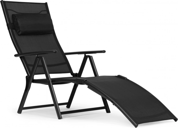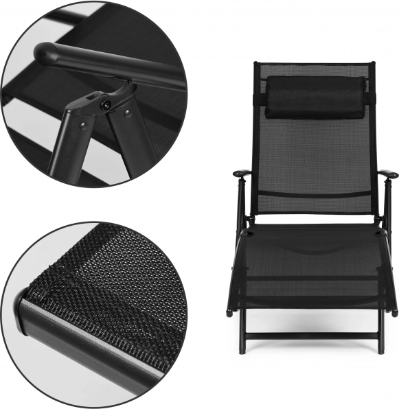 De stijlvolle zwarte MULTIGARDEN ligstoel is ontworpen voor ontspannen comfort in de tuin, op het terras en bij het zwembad. De ademende textielnetstof past zich aan het lichaam aan en zorgt voor uitstekende ventilatie, terwijl het robuuste stalen frame met poedercoating stabiliteit en een lange levensduur biedt. Inclusief een zacht afneembaar hoofdkussen voor nog aangenamer ontspanning.