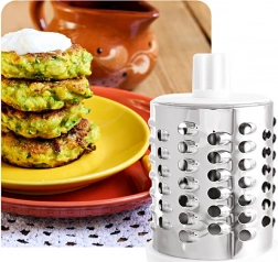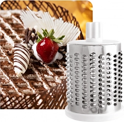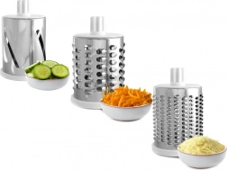 De set bevat 3 verwisselbare trommels: fijn voor kaas of noten, grof voor groenten in salades en een snijtrommel voor dunne en gelijkmatige plakjes. Alles is in een handomdraai te monteren en te reinigen.
