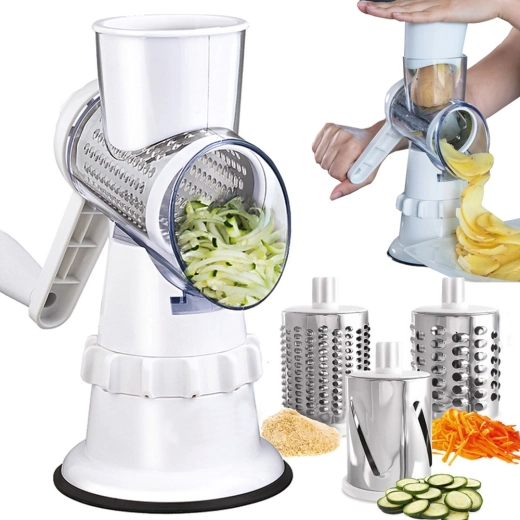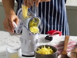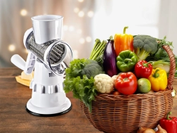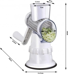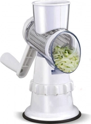 Bespaar tijd in de keuken met de multifunctionele snijder die zowel fijn als grof raspen en precies snijden in plakjes aankan. Het apparaat blijft stevig op het werkblad dankzij de antislip-zuignap en wordt bediend met een comfortabele handslinger. Ideaal voor komkommer, courgette, wortel, aardappelen, kaas, noten en andere ingrediënten.