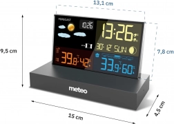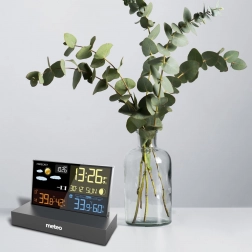 Het weerstation METEO SP110C biedt een volledig overzicht van het weer en het binnenklimaat. De draadloze sensor verzendt gegevens over temperatuur en vochtigheid tot op een afstand van 60 m, terwijl het kleurendisplay met overzichtelijke pictogrammen de voorspelling voor 12–24 uur, de maanfasen en de druktrend van de geïntegreerde barometer weergeeft. Dankzij de DCF-radio-gestuurde klok heeft u altijd de juiste tijd; het alarm met snooze-functie maakt elke ochtend aangenamer.