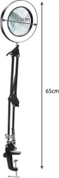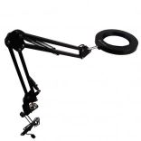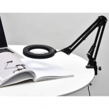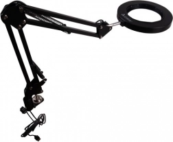 De IZOXIS loeplamp combineert modern design, flexibele armen en kwaliteitsoptiek voor nauwkeurig detailwerk. De ringvormige LED-krans verlicht het gebied rond de lens gelijkmatig en verhoogt contrast en leesbaarheid van details zonder oogvermoeidheid. De metalen schroefklem houdt de lamp stevig op tafelbladen tot 5 cm dik.