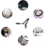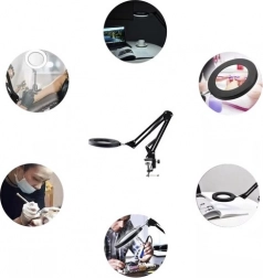 De praktische bureaulamp met loep van IZOXIS biedt heldere, ringvormige LED-verlichting, stabiele tafelklem en een glazen optische lens voor nauwkeurig werken zonder vervorming. Dankzij 10 helderheidsniveaus en 3 kleurtemperaturen (warm, neutraal, koud) pas je de verlichting eenvoudig aan voor cosmetica, modelbouw, lezen en fijn handwerk. Voeding via USB en een in-line afstandsbediening zorgen voor maximaal gemak.