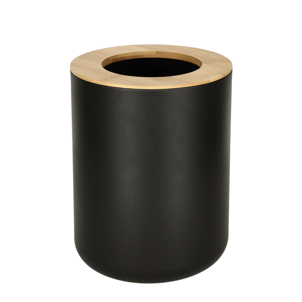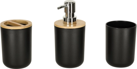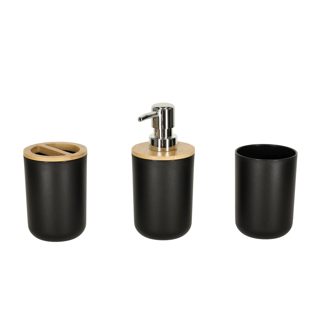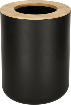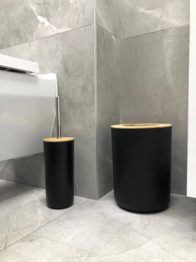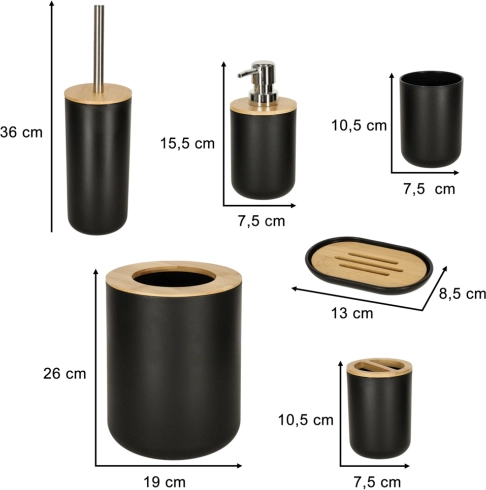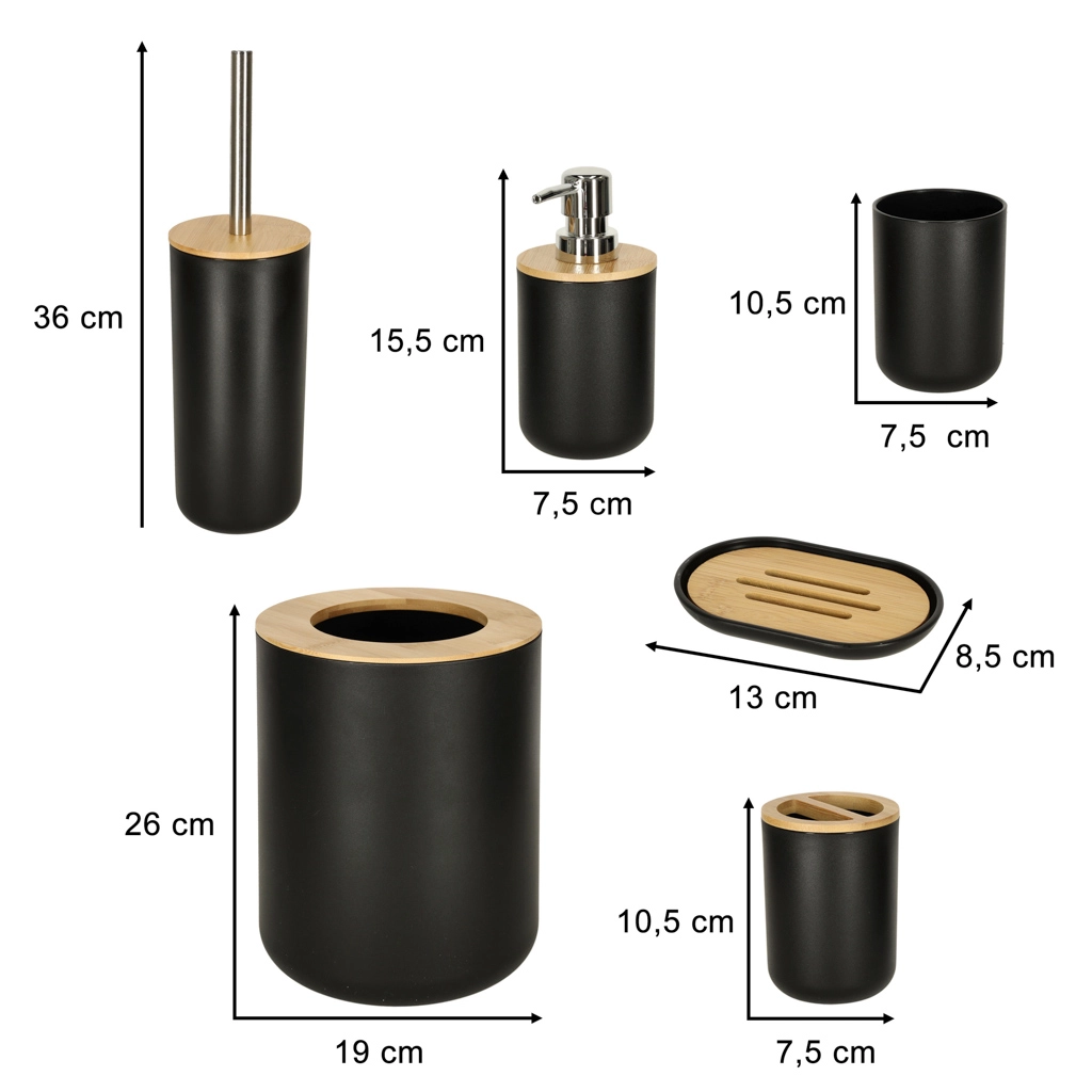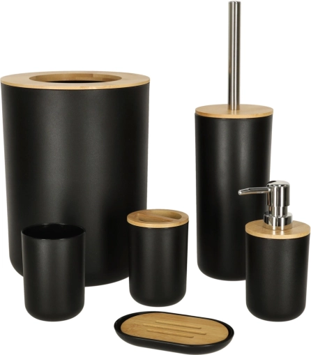 Elegante 6-delige set badkameraccessoires in het zwart met houten accenten die het uiterlijk van je badkamer harmoniseert en de organisatie vergemakkelijkt. Bevat een prullenbak, wc-borstel met houder, zeeppompje, beker, tandenborstelhouder en zeepbakje. De combinatie van duurzaam kunststof en hout zorgt voor een lange levensduur, modern design en eenvoudig onderhoud.