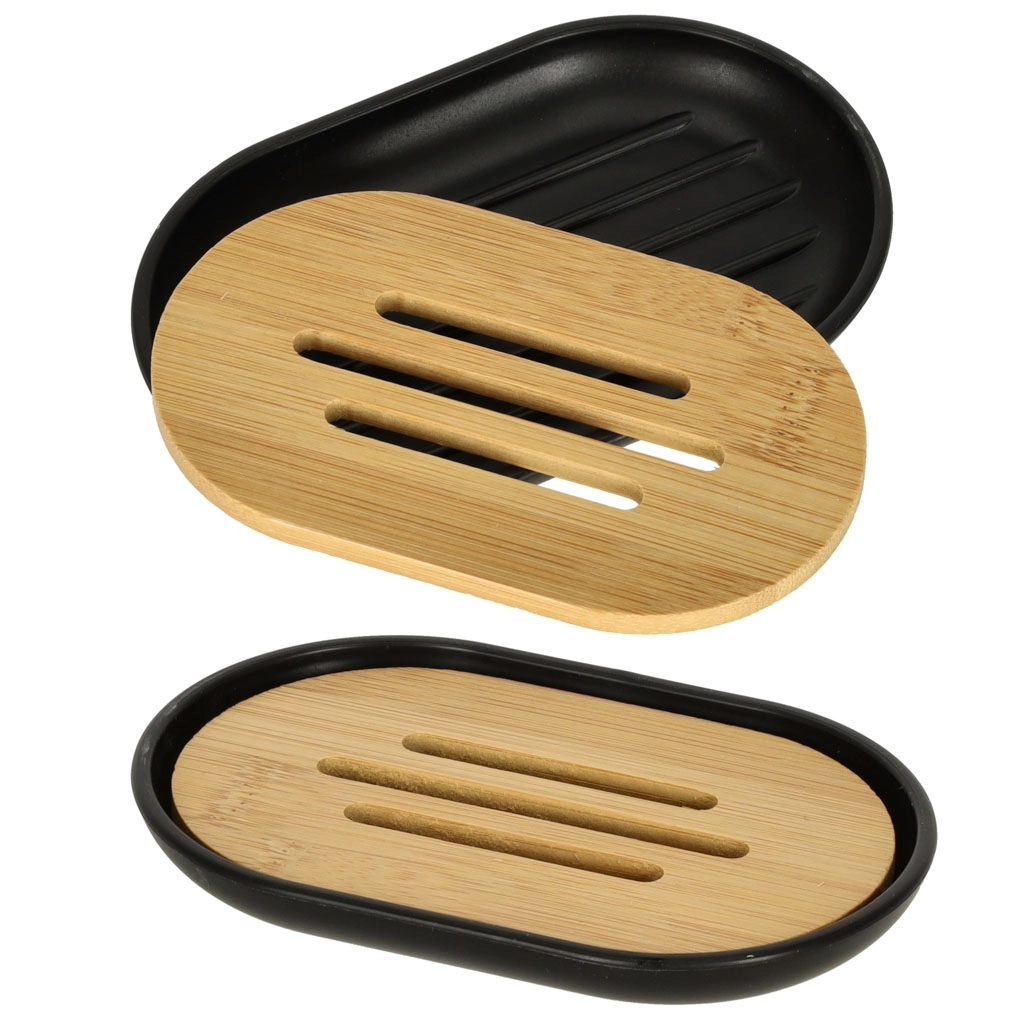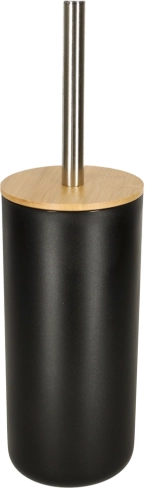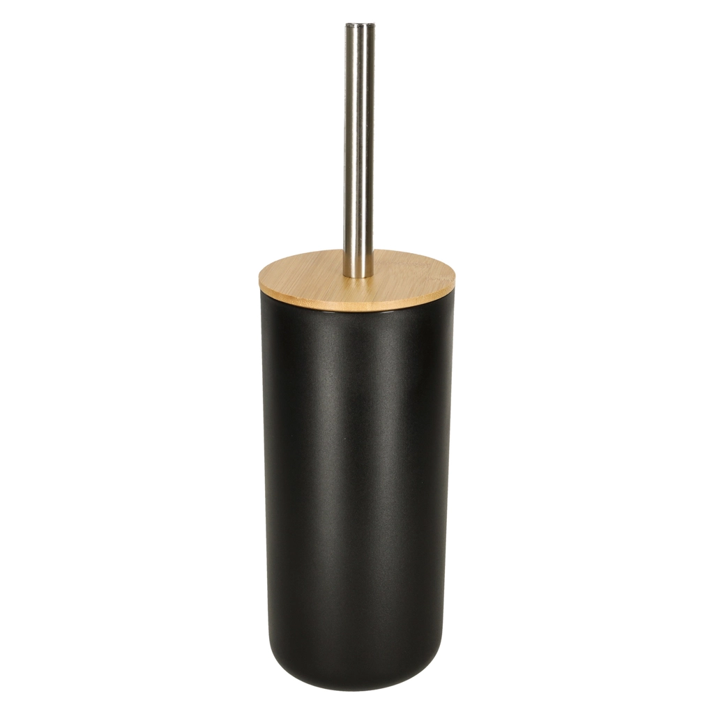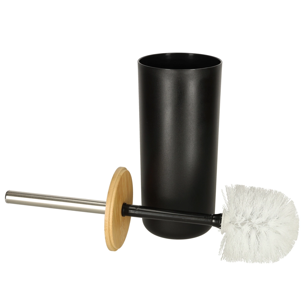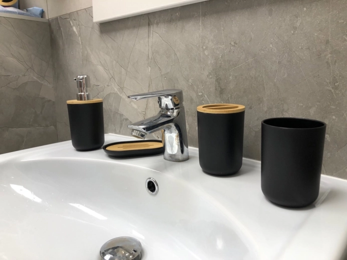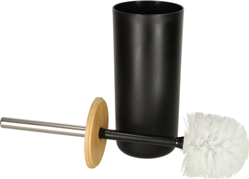 Elegante 6-delige set badkameraccessoires in het zwart met houten accenten die het uiterlijk van je badkamer harmoniseert en de organisatie vergemakkelijkt. Bevat een prullenbak, wc-borstel met houder, zeeppompje, beker, tandenborstelhouder en zeepbakje. De combinatie van duurzaam kunststof en hout zorgt voor een lange levensduur, modern design en eenvoudig onderhoud.