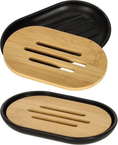 - Universele stijl: zwart met hout past bij de meeste badkamers