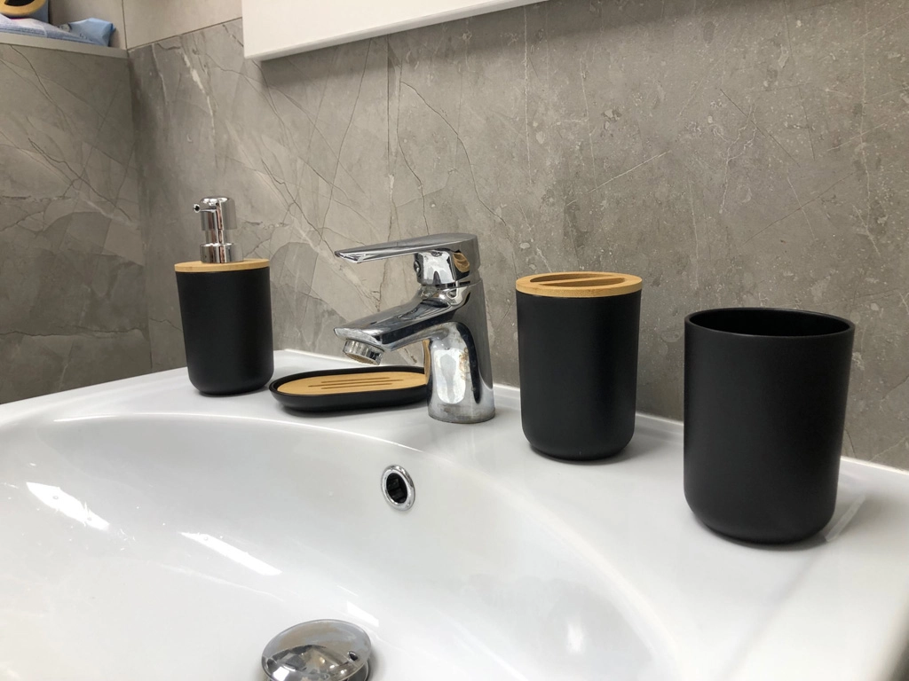 - Zeepbakje, zeeppompje, tandenborstelhouder, beker, wc-borstel met houder, prullenbak