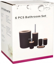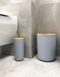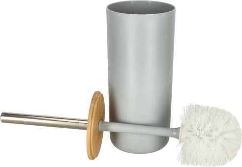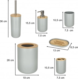 Creëer een uniforme en praktische ruimte met deze complete badkamerset in het grijs. De combinatie van duurzame kunststof en natuurlijke houten details brengt een modern design dat past in zowel moderne als klassieke badkamers. De chromen pomp van de dispenser en de hoogwaardige metalen handgreep van de wc-borstel benadrukken zowel functionaliteit als esthetiek.