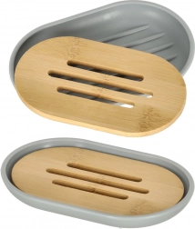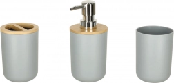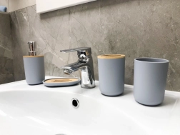 De dispenser met chromen pomp, tandenborstelhouder, beker en zeepschaaltje met bamboe inleg zorgen elke dag voor orde en hygiëne.