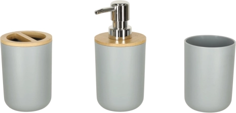 Stijlvolle 6-delige badkamerset in elegant grijs met natuurlijke houten accenten die de look van je badkamer unify en alles biedt wat je nodig hebt voor dagelijkse hygiëne. Bevat een zeepdispenser, beker, tandenborstelhouder, zeepschaaltje, wc-borstel met houder en een prullenbak. Duurzame kunststof en eenvoudig onderhoud zorgen voor een lange levensduur en een modern, minimalistisch uiterlijk.