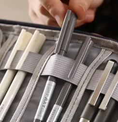 Binnenin vind je 6 meshvakken voor snel overzicht en 8 elastische banden voor stevige fixatie van je accessoires. De ritssluiting beschermt de inhoud, schuimvulling dempt schokken en het polsriempje maakt dragen eenvoudig. Geschikt voor werk, studie en reizen.