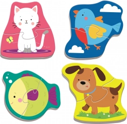 Ontdek de eerste puzzels voor peuters – 4 schattige puzzels in de vorm van huisdieren. Elk plaatje bestaat uit 2 grote stukken, zodat kinderen snel succes ervaren en met plezier opnieuw en opnieuw puzzelen. Intense kleuren en vriendelijke illustraties nodigen vanzelf uit tot spel.