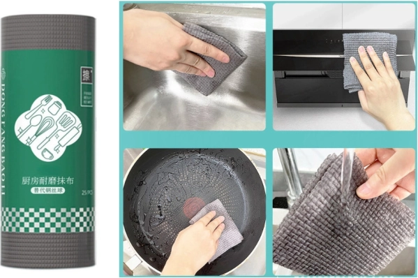 Houd je keuken perfect schoon met een rol grijze doeken en schuursponzen van 20 × 9 cm. In de verpakking vind je 25 stuks, perfect voor het opdweilen van gemorste vloeistoffen, het reinigen van werkbladen, spoelbak en apparaten. Dankzij de praktische rol scheur je eenvoudig het benodigde stuk af en gebruik je het direct.