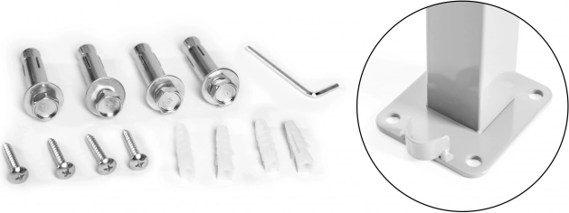 De montage van het scherm is eenvoudig en snel, zodat je het gemakkelijk kunt plaatsen zonder gespecialiseerde vaardigheden of gereedschap. De twee palen kunnen voor extra stabiliteit en veiligheid eenvoudig aan zowel de muur als de vloer worden bevestigd dankzij de meegeleverde montagematerialen.