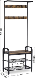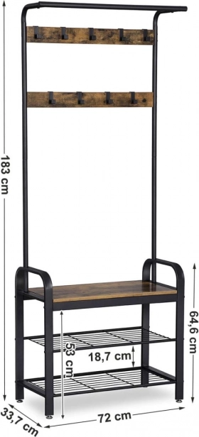 Deze universele kapstok voor in de hal temt jassen, jacks en accessoires en biedt tegelijk een comfortabel plekje om schoenen aan te trekken. Dankzij het robuuste metalen frame en de houten planken in rustieke decor krijgt u een duurzaam en stijlvol meubelstuk dat perfect past in moderne en industriële interieurs.