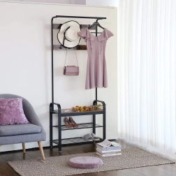 Het bovendeel heeft 9 stevige haken verdeeld over twee rijen voor beter overzicht. Er is ook een stang voor het ophangen van sjaals, doeken of overhemden aan een hanger. Het onderste deel biedt 2 luchtige draadplanken voor schoenen en een bank met een draagvermogen van 80 kg, wat het dagelijks aan- en uittrekken vergemakkelijkt.
