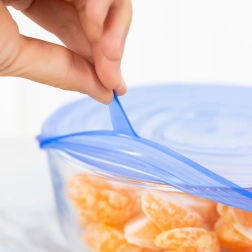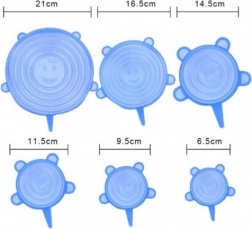 Zes deksels in verschillende diameters passen op glazen, kommen, pannen en aangesneden fruit – van kleine bekers tot grote schalen.