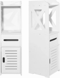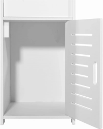 Deze smalle witte kast is ontworpen om zelfs zeer krappe ruimtes efficiënt te benutten. Open en afsluitbare opbergruimtes maken het mogelijk schoonmaakmiddelen of cosmetica uit het zicht te bewaren en toch vaak gebruikte items binnen handbereik te houden. De luchtige, moderne uitstraling geeft het interieur lichtheid en frisheid.