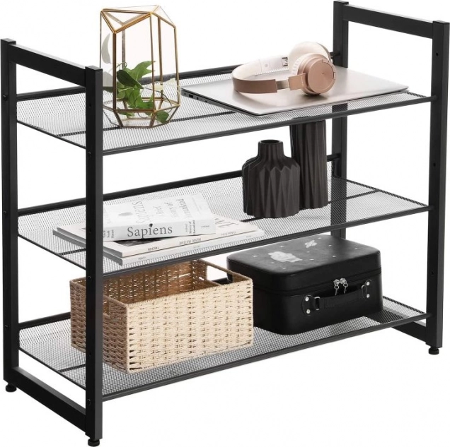 Praktisch metalen schoenenrek met drie niveaus houdt orde in hal en garderobe. Dankzij het metalen gaas zorgt het voor uitstekende ventilatie van schoenen, heeft het een stabiele en duurzame constructie en een elegante zwarte afwerking die past in moderne en industriële interieurs. Biedt plaats aan tot 12 paar schoenen en wordt geleverd als eenvoudige zelfmontage.