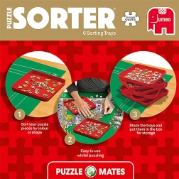 Na het puzzelen stapel je de kommen eenvoudig op elkaar – de stapelbare constructie bespaart ruimte en de hele sorteerset met stukjes kan terug in de puzzeldoos worden opgeborgen. Ideale hulp voor zowel beginners als veeleisende puzzelliefhebbers.