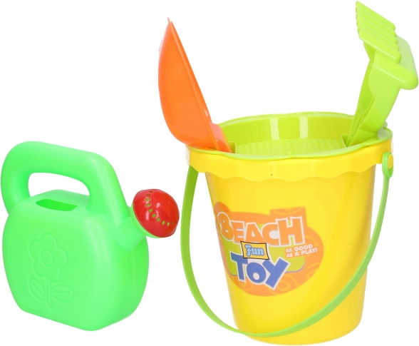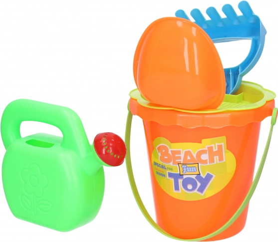 In de set vind je alles wat je nodig hebt voor het bouwen van kastelen, zandvormpjes en water geven: een emmer, zeef, gieter, hark en schep. Kies uit twee vrolijke kleuren – geel en oranje, zodat kinderen hun eigen set makkelijk herkennen.