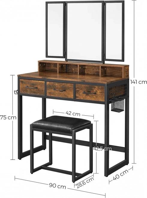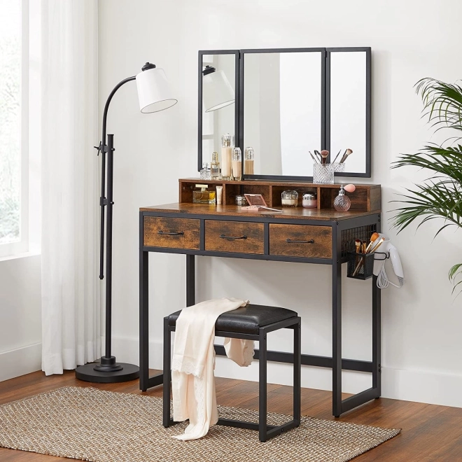 Creëer je eigen beautyhoek. Deze kaptafel combineert een rustieke houtdecor met een zwart metalen frame voor een moderne, industriële look. De driedelige klapspiegel biedt de perfecte hoek tijdens het opmaken en beschermt de oppervlakken tegen stof wanneer hij is gesloten. De zijpanelen van de spiegel hebben haakjes voor kettingen, onder het bovenblad vind je vakken voor je meest gebruikte cosmetica.