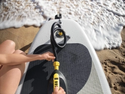 Steek de stekker in de 12V-aansluiting van de auto en je kunt direct beginnen met oppompen op het strand of op de camping.