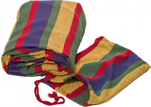 Inclusief stoffen etui in dezelfde kleuren. De hangmat neemt weinig ruimte in en is gemakkelijk mee te nemen.