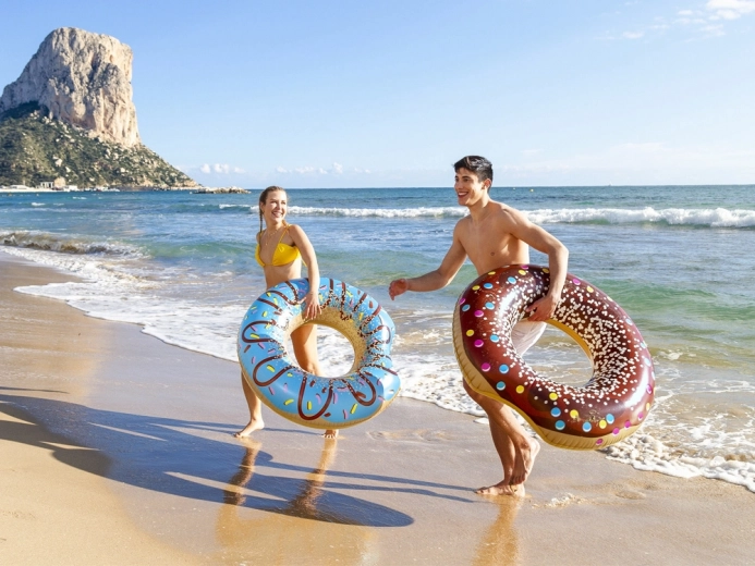 Deze stijlvolle band in de vorm van een aangebeten donut valt op door zijn felle kleuren en speelse uitstraling. Dankzij de diameter van 107 cm is hij geschikt voor volwassenen en oudere kinderen en biedt hij uitstekende ondersteuning tijdens het ontspannen op het water.