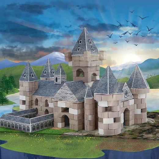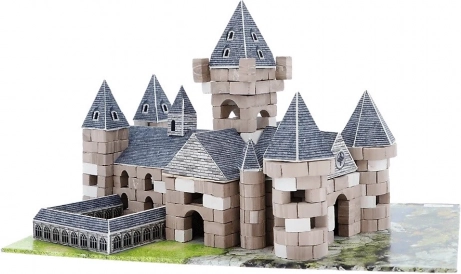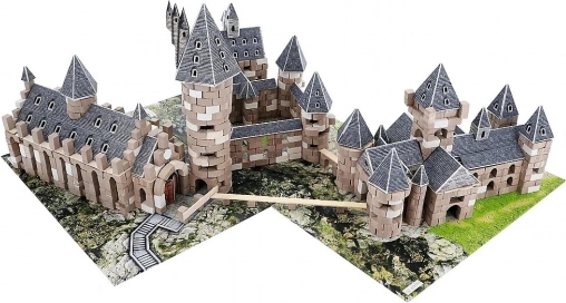 Authentieke ervaring: stapel echte kleibaksteentjes, snijd en lijm houten latjes en creëer een gedetailleerd deel van Hogwarts met torentjes en galerijen.