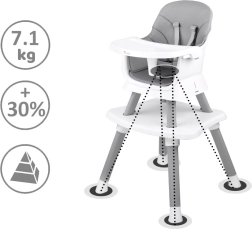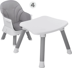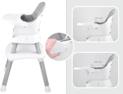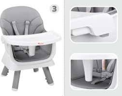 Praktische 6-in-1 kinder eetstoel die meegroeit met je kind vanaf 6 maanden. Biedt een modulaire constructie, veilige 5-puntsgordels, een gemakkelijk afneembare en ademende bekleding, een afneembaar blad en antislip pootjes. Dankzij de verschillende configuraties dient hij als hoge en lage stoel, stoelverhoger voor de eettafelstoel, losse stoel met tafeltje en als speeltafel voor bouwblokjes.