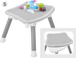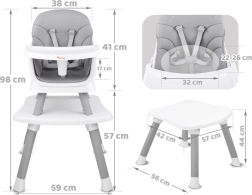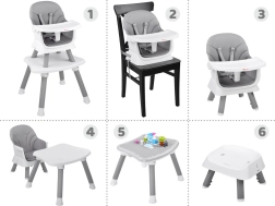 • 6-in-1: hoge stoel met blad, stoelverhoger voor de eettafelstoel, lage stoel met blad, stoel + tafeltje, speeltafel met blokjesblad, lage kruk/poef